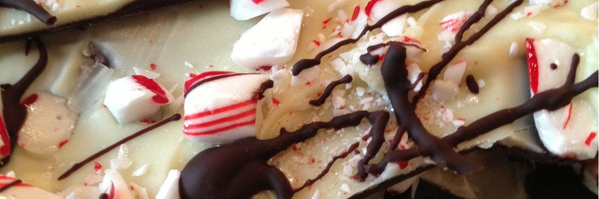 White & Dark Chocolate is swirled together on a large bakery sheet pan. Next we sprinkle crushed peppermint candy canes, dragees & sparkly sugar over top This bark has a light...